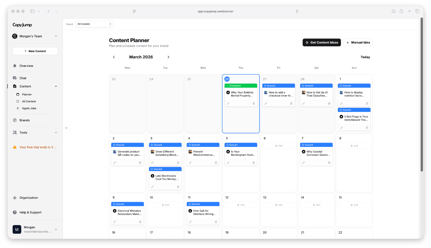ChatGPT is a blank canvas. CopyJump is a complete content system—calendar, brand profiles, SEO research, internal linking, and an AI agent that writes while you sleep. All matching your exact brand voice.